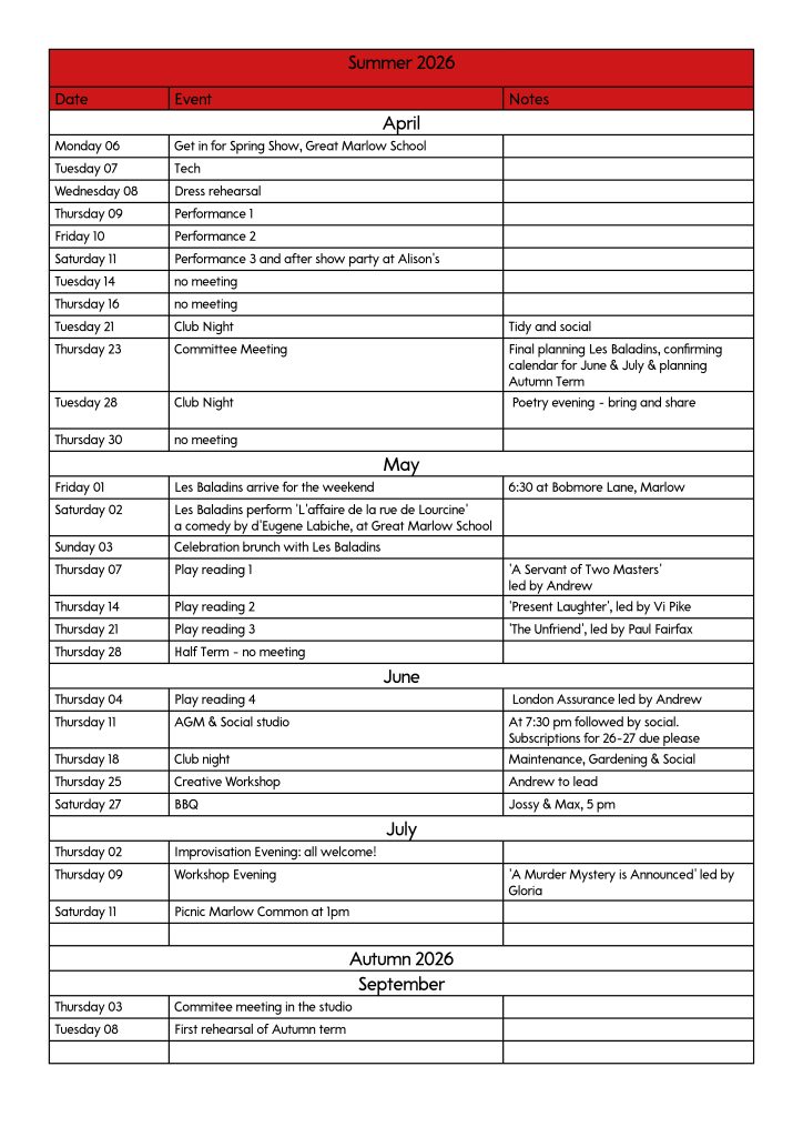 If you would like any more details of the above events and rehearsals please contact Hilary, our membership secretary at secretary@marlowplayers.org.uk