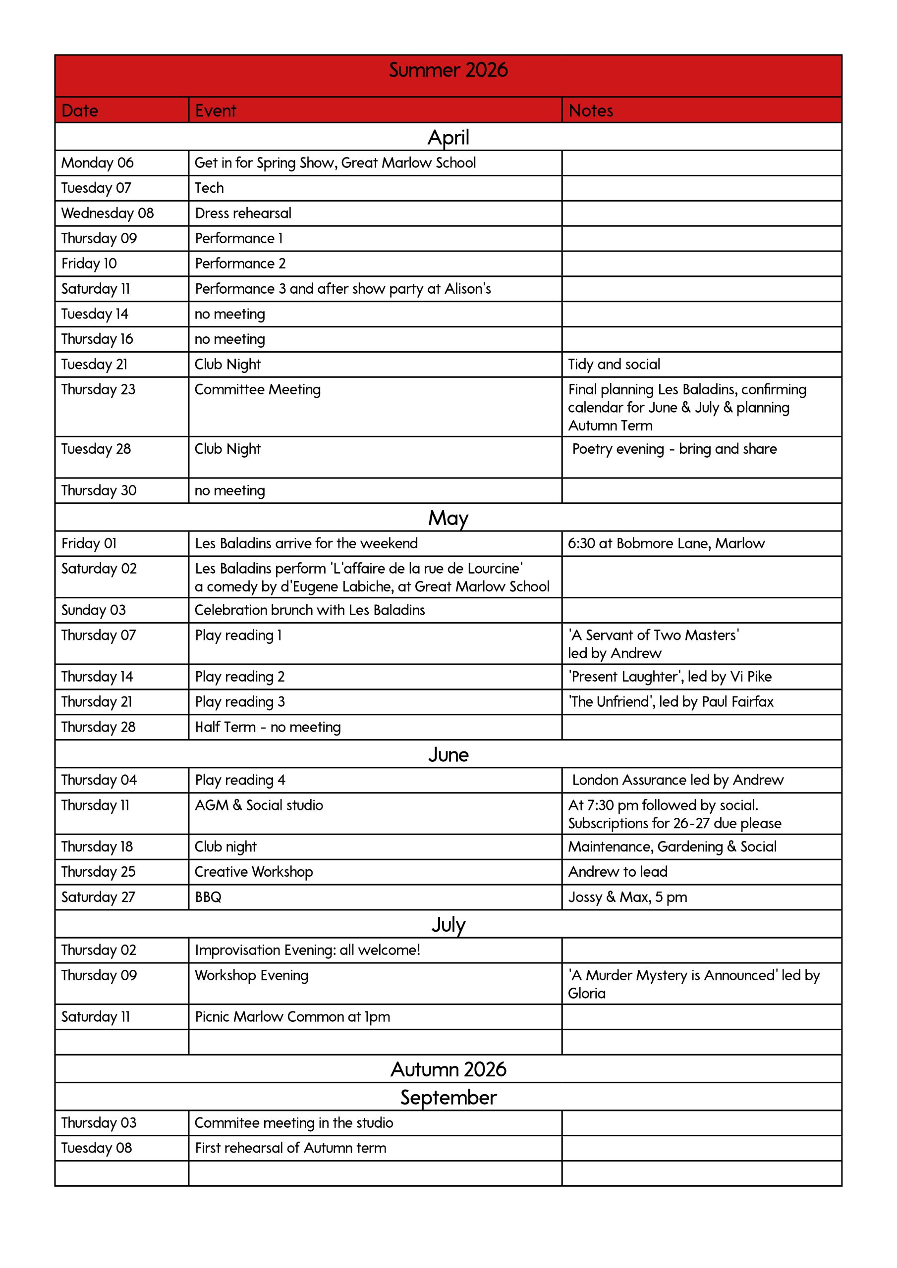 Autumn term starts on Tuesday 8th Sept when we will be working towards our Murder Mystery Evenings in November and December, as well as choosing our Spring Production. We will also be going to Marly-le-Roi in May and celebrating our ninetieth anniversary to boot: watch this space!.